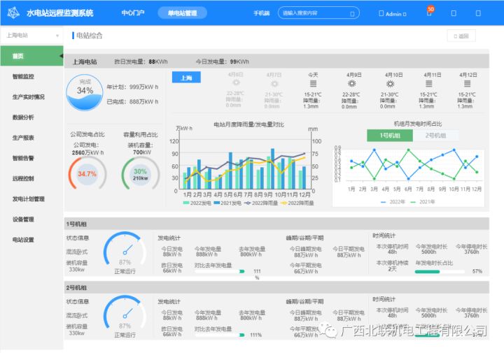 水電站分布位置、總發(fā)電量、計(jì)劃發(fā)電完成率、電站發(fā)電排名情況、電量對(duì)比等。